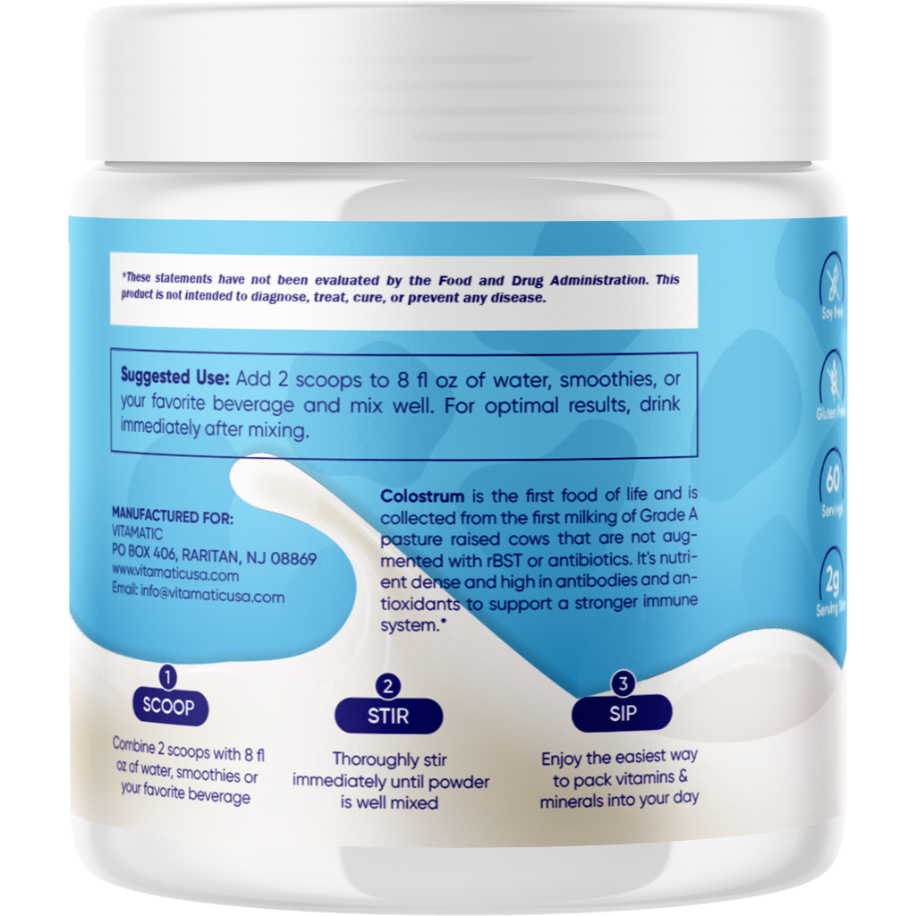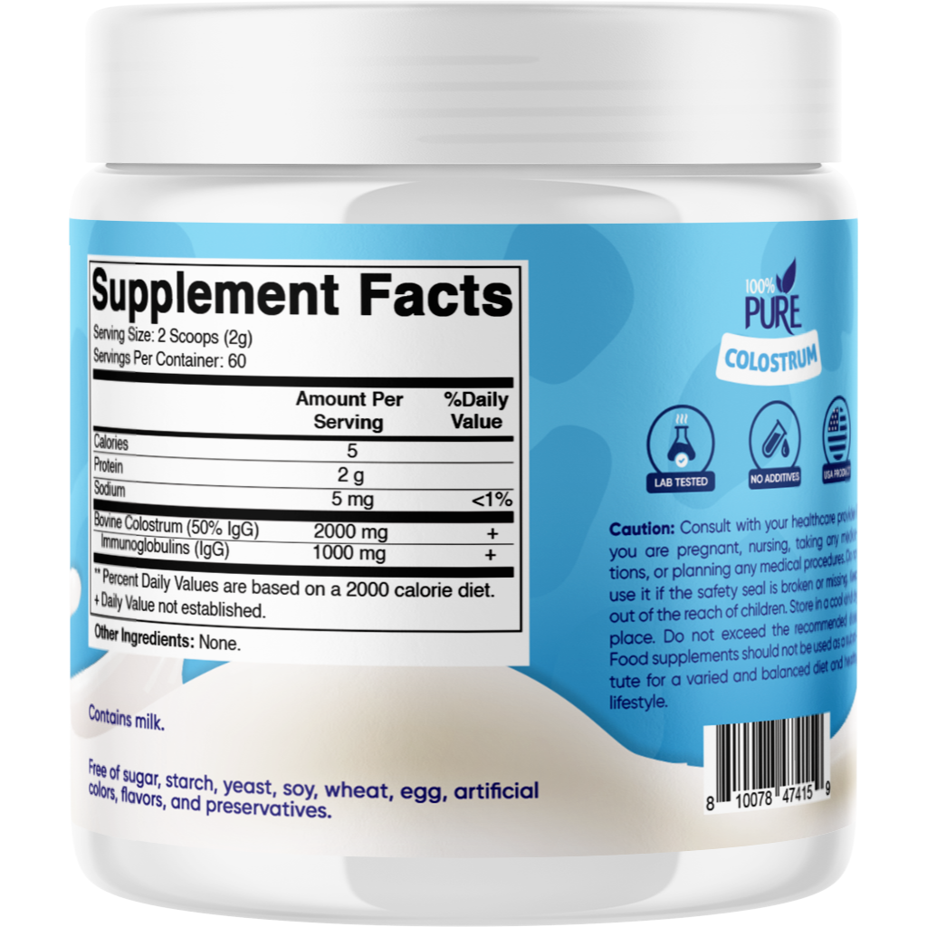 - Each serving contains 2 grams of pure bovine colostrum, with 60 servings per container.