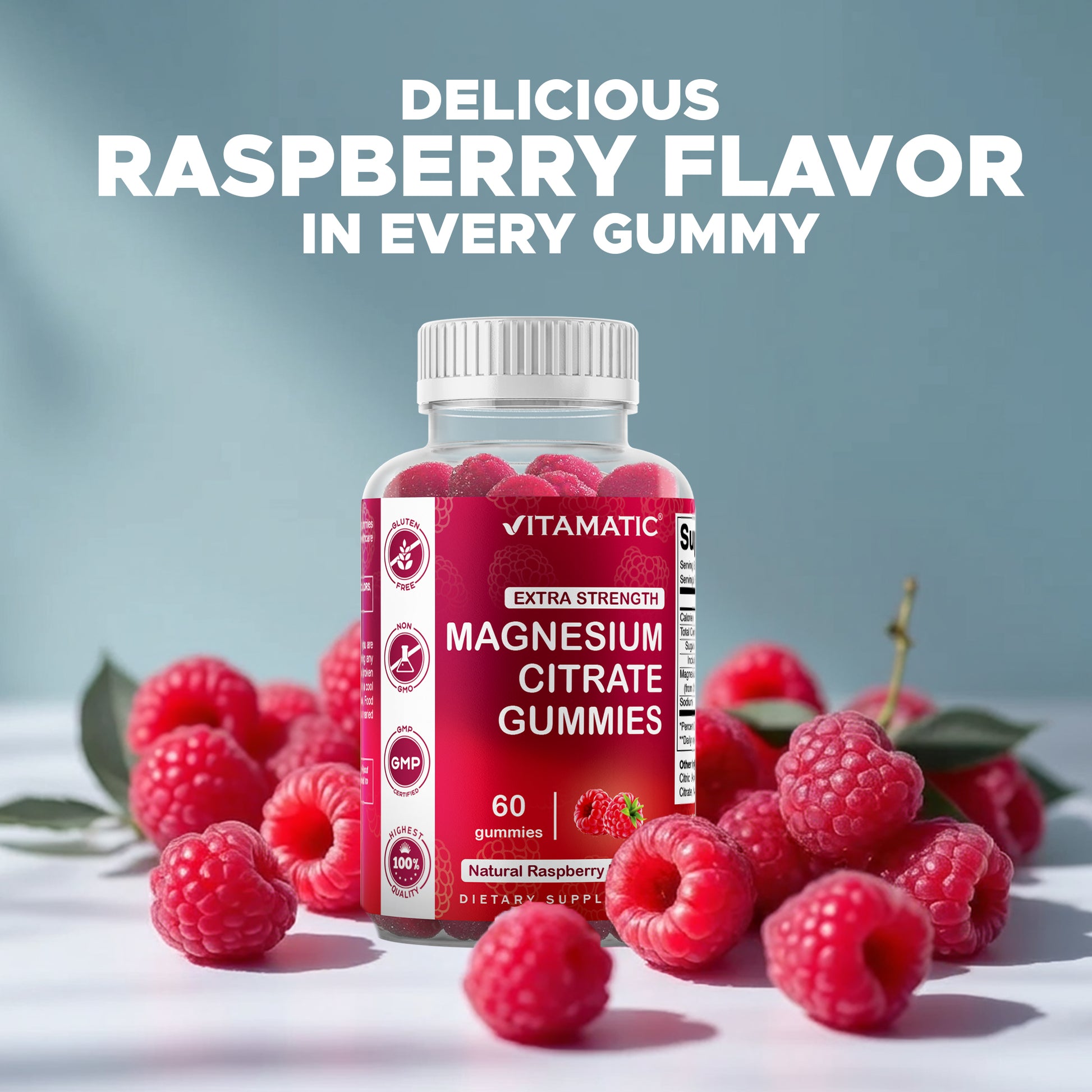 DELICIOUS NATURAL RASPBERRY TASTE of Vitamatic Magnesium Gummies - Avoid consuming Large Magnesium Capsules, Tablets or Pills which gives unpleasant after taste & can not go down easily.