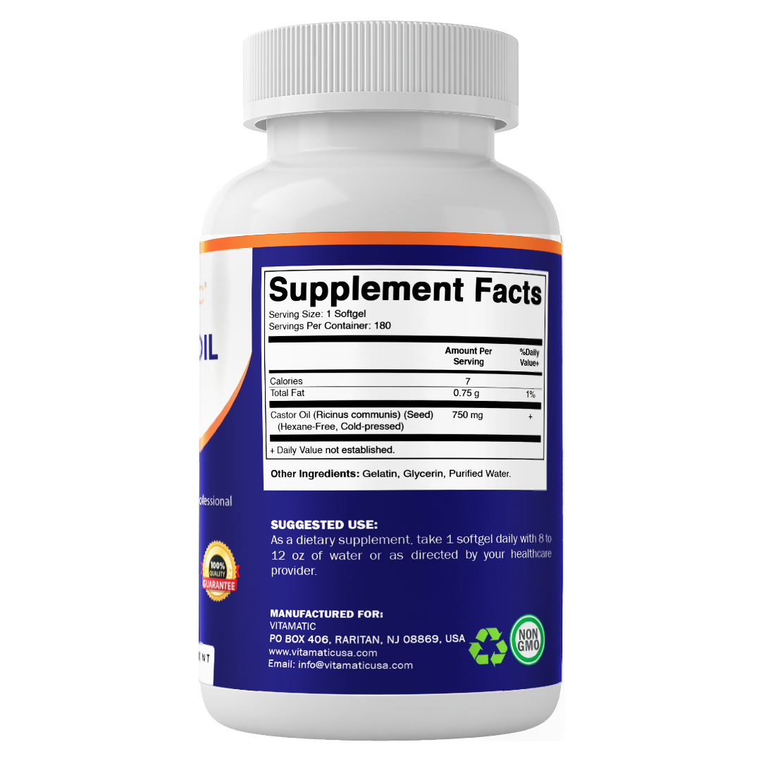 - Cold-Pressed Castor Oil – Each Vitamatic softgel delivers 750 mg of cold-pressed castor oil in a convenient capsule form.