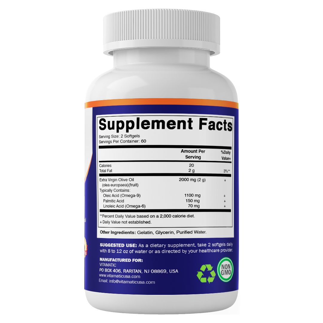 - Premium Extra Virgin Olive Oil: Provides 2000 mg per serving (2 softgels) of pure olive oil sourced from Olea europaea fruit.