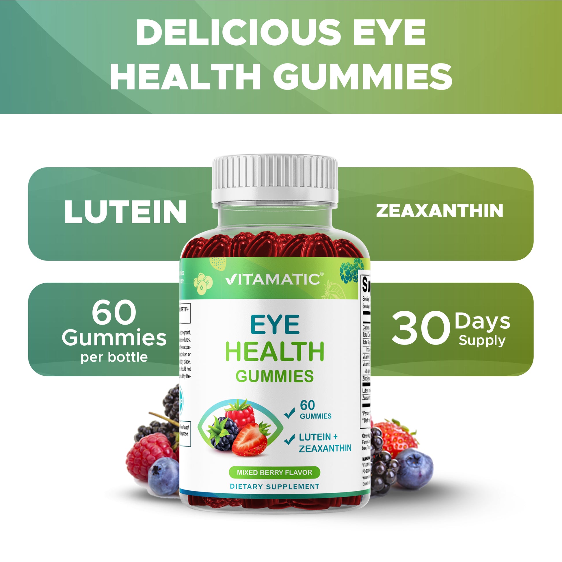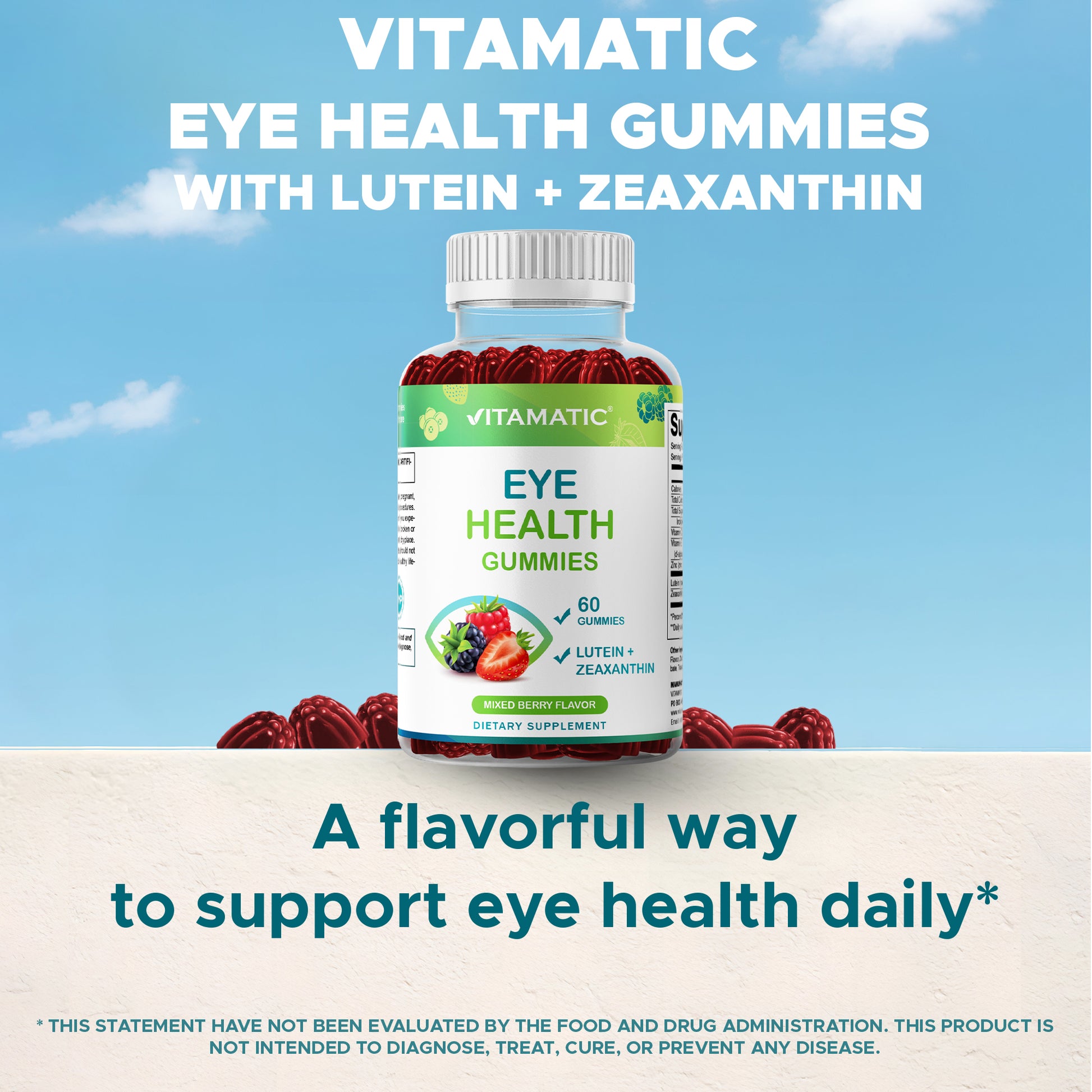 Vitamatic Eye Health Gummies with Lutein, Zeaxanthin, Vitamin C, E & Zinc – Mixed Berry Flavor – 60 Gummies