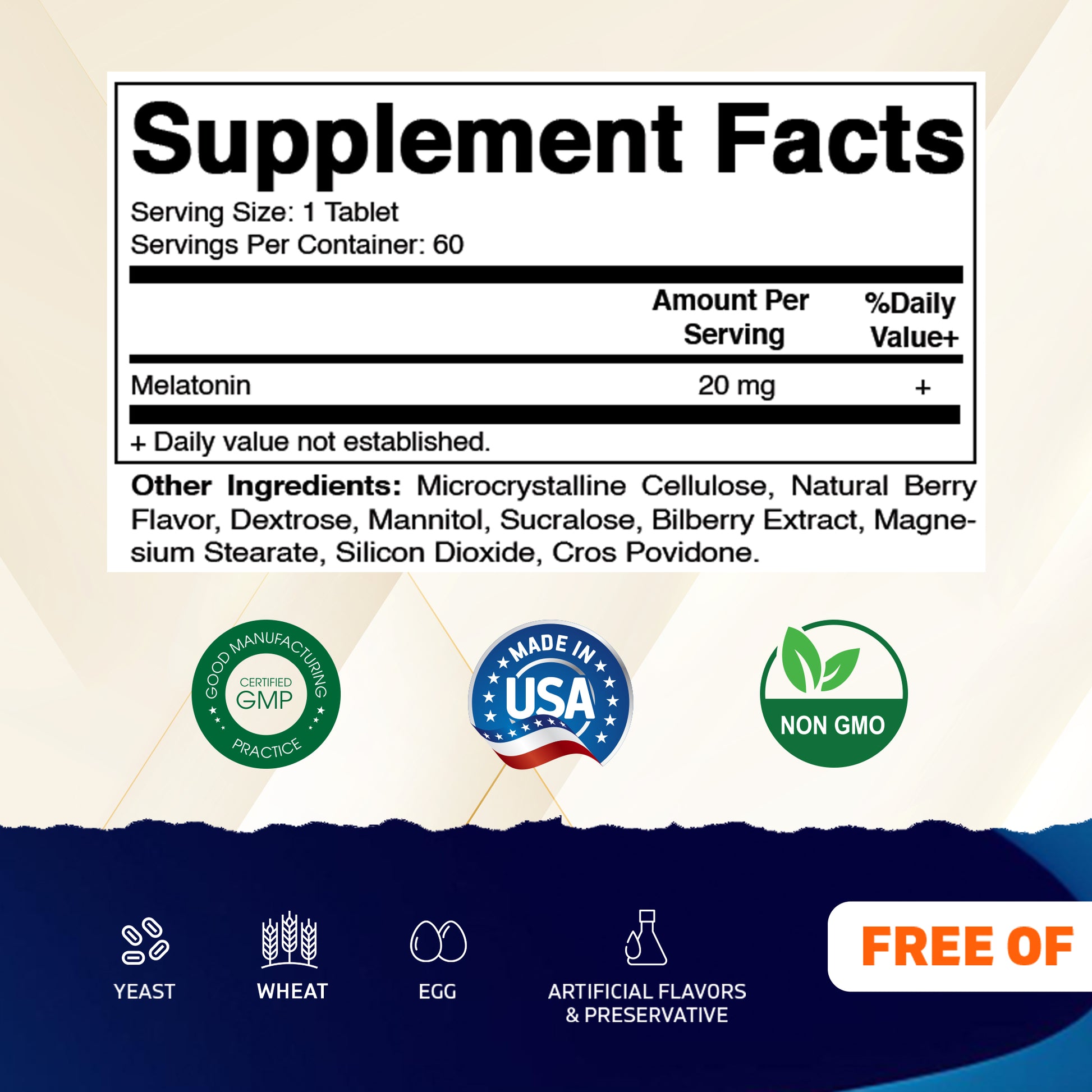 - FAST DISSOLVE NATURAL BERRY FLAVOR MELATONIN - Our fast dissolve tablets contain 20mg of melatonin.