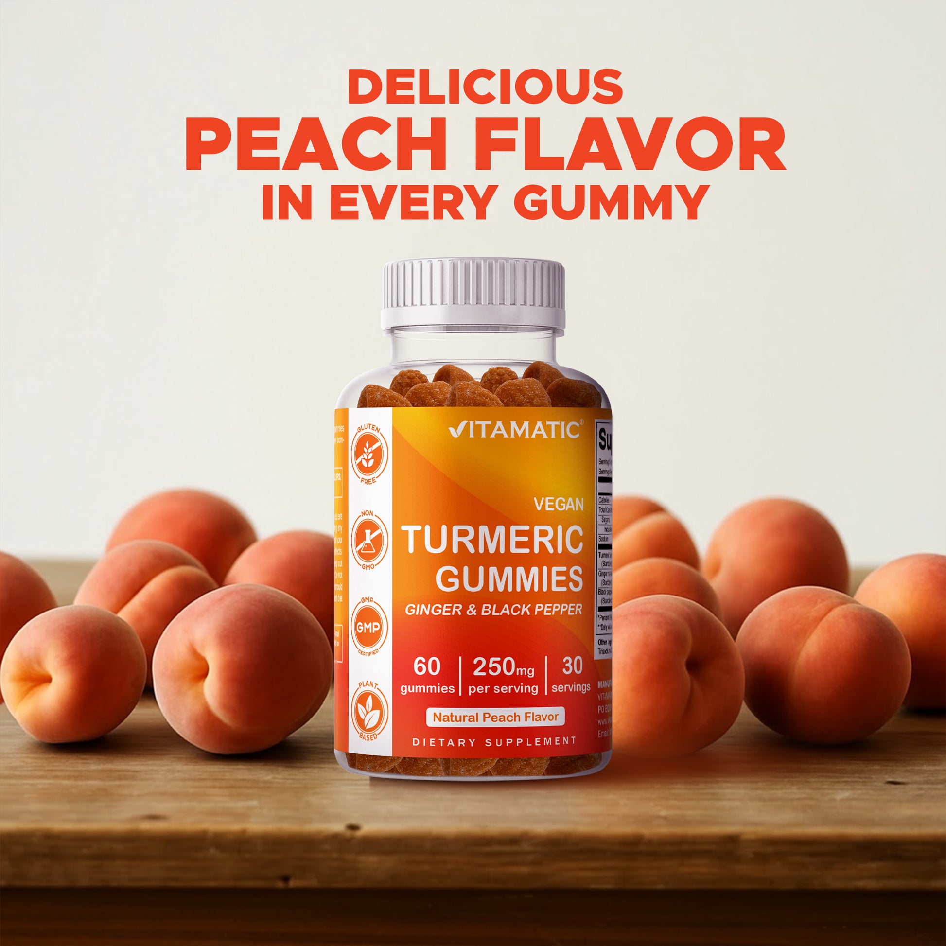 - DELICIOUS NATURAL PEACH TASTE of Vitamatic Turmeric Gummies - Avoid consuming Large Turmeric Ginger Capsules, Tablets or Pills which gives unpleasant after taste & cannot go down easily.